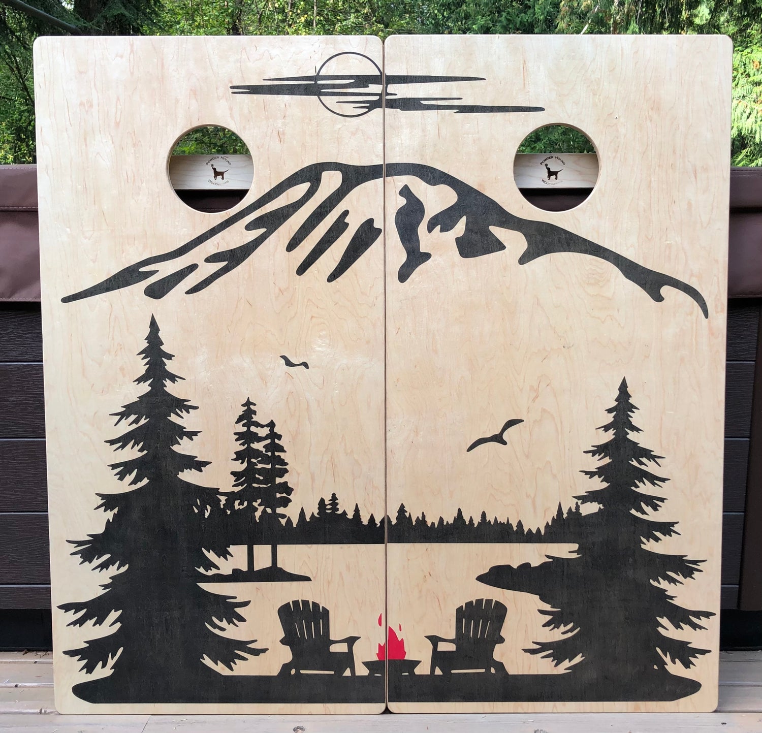 Immerse yourself in nature's splendor while playing cornhole on our Mt. Rainier-inspired boards.