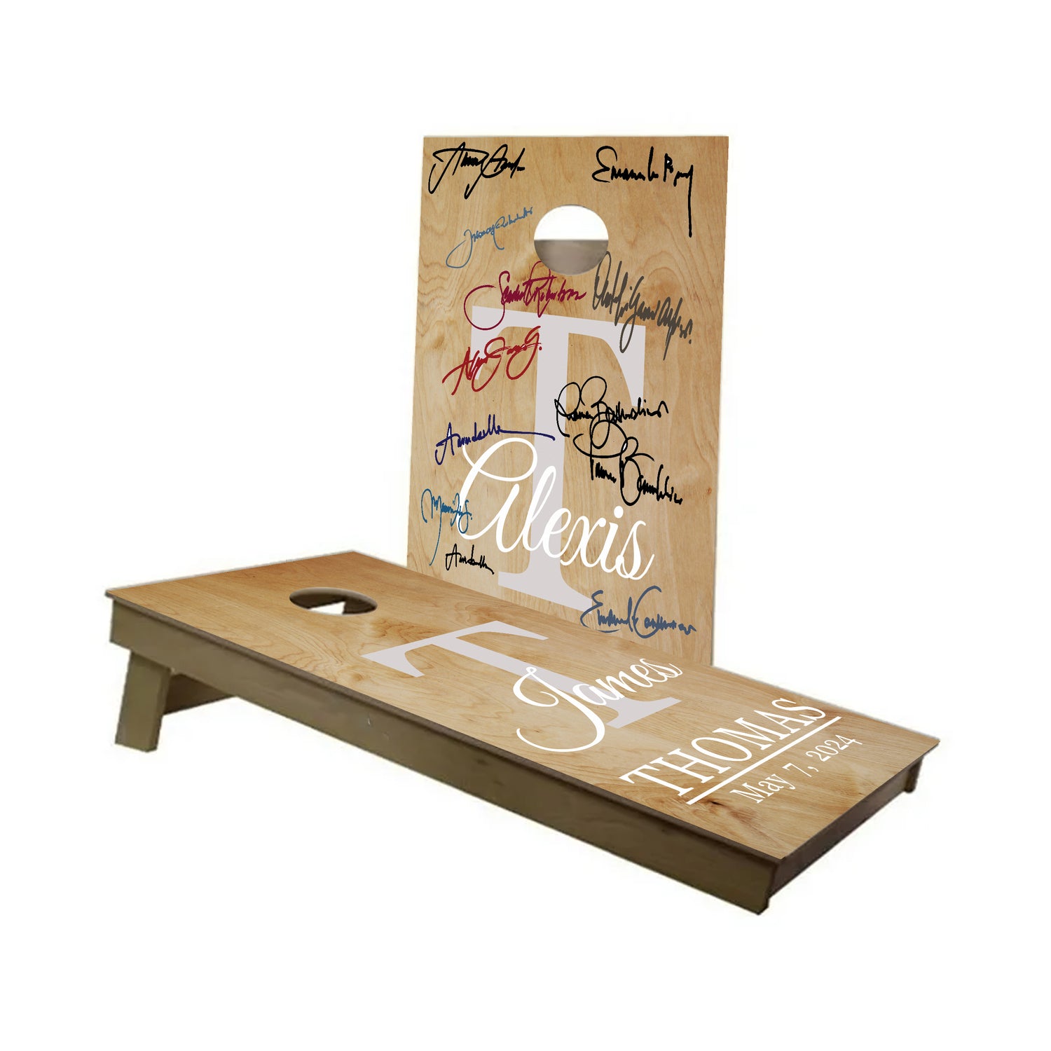 Bring the fun with our custom wedding cornhole board set! Choose our unique wedding guest book signature option to preserve the memories from your special day.